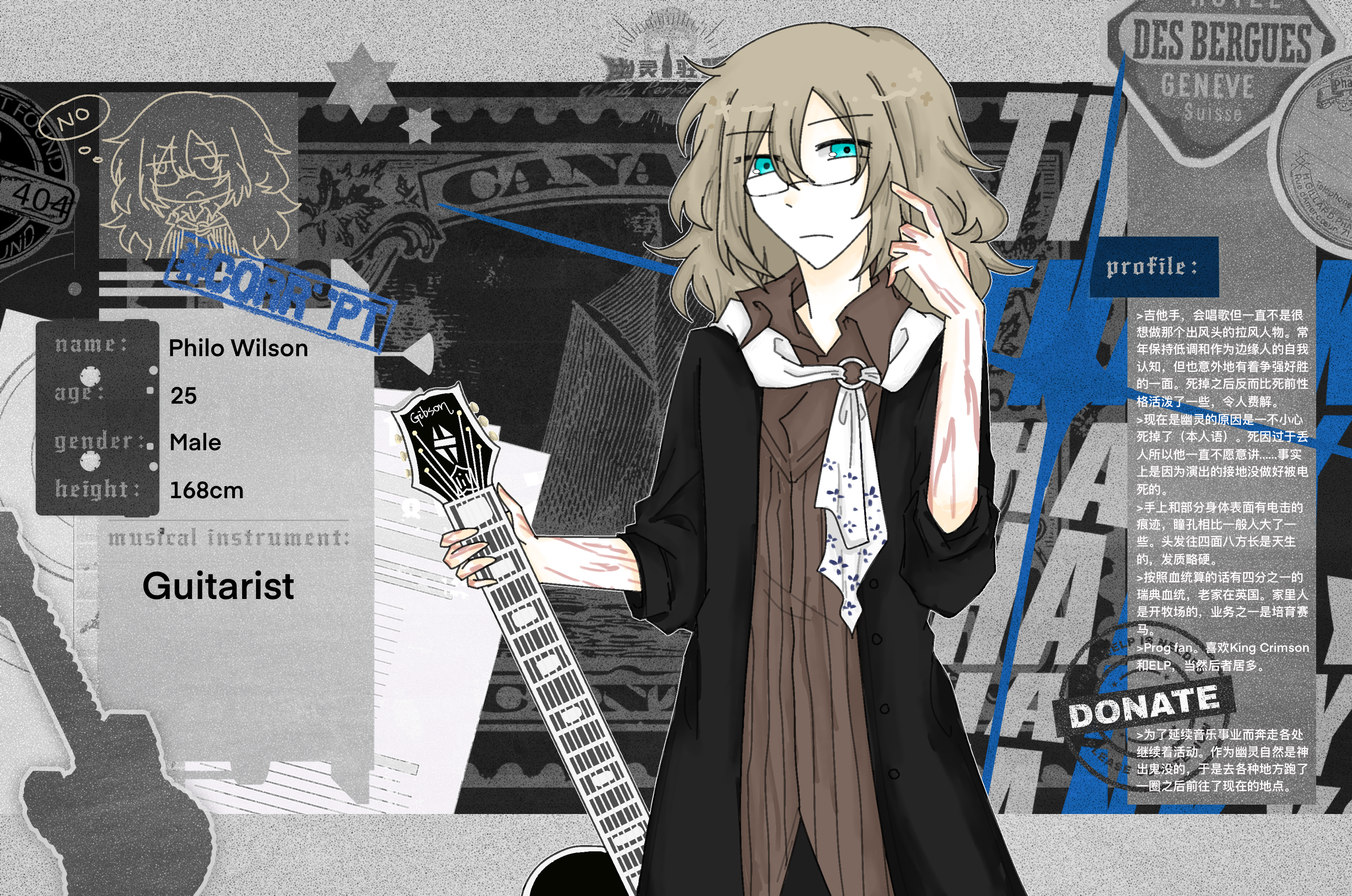 - 吉他手,会唱歌但一直不是很想做那个出风头的拉风人物。常年保持低调和作为边缘人的自我认知,但也意外地有着争强好胜的一面。死掉之后反而比死前性格活泼了一些,令人费解。